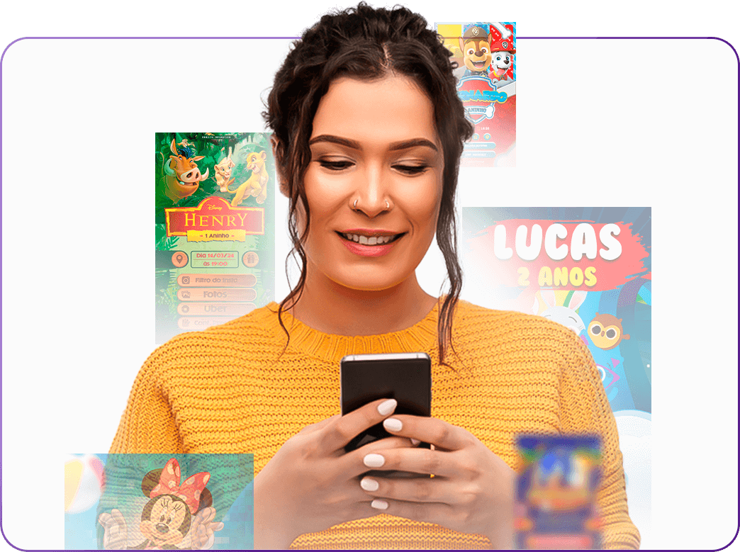 Nossos convites são totalmente personalizáveis. Após escolher o modelo, você pode nos enviar os detalhes do tema da festa, cores preferidas, fotos e qualquer outra informação que deseja incluir. Nossos designers trabalharão para criar um convite único e especial para o seu evento.