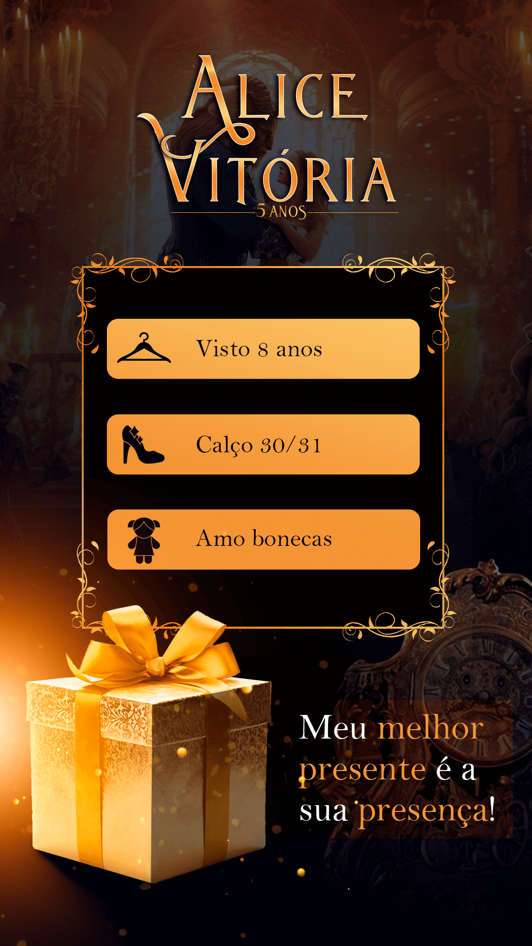Imagine um convite que não só informa, mas também encanta e envolve. Nossos convites interativos oferecem uma experiência única com galeria de fotos, dicas de presentes, localização integrada, opção de chamar Uber e confirmação de presença diretamente pelo WhatsApp ou Google Planilhas. É a forma perfeita de tornar o seu evento inesquecível!